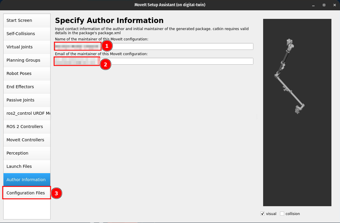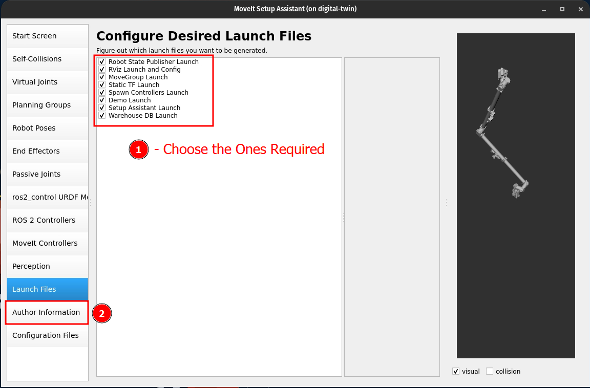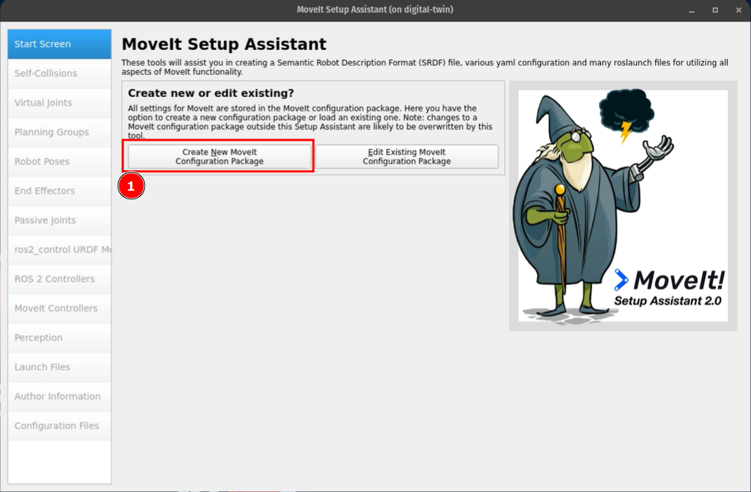 ros2 launch moveit_setup_assistant setup_assistant.launch.py This should launch a new window , so click on Create a New Moveit Configuration Package as seen below: