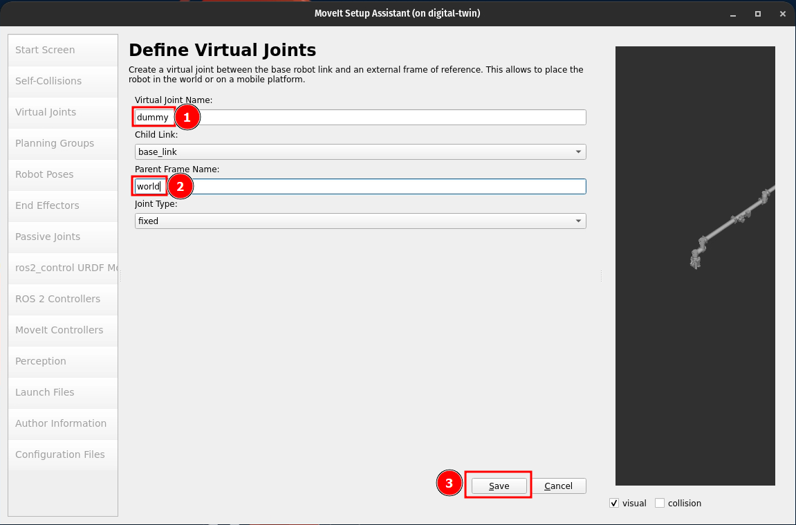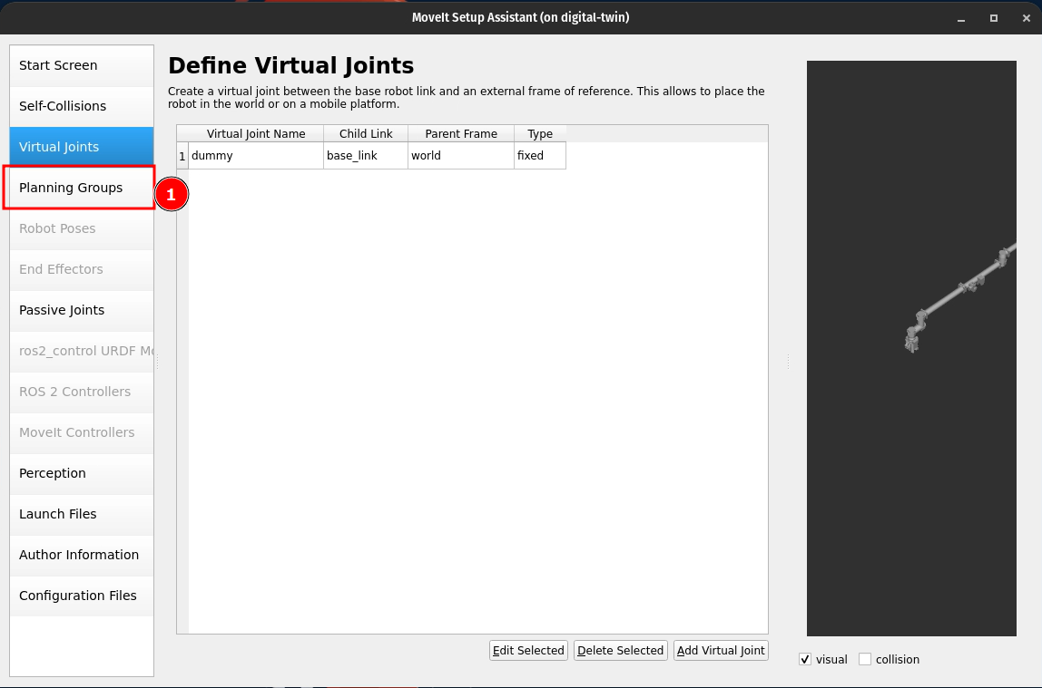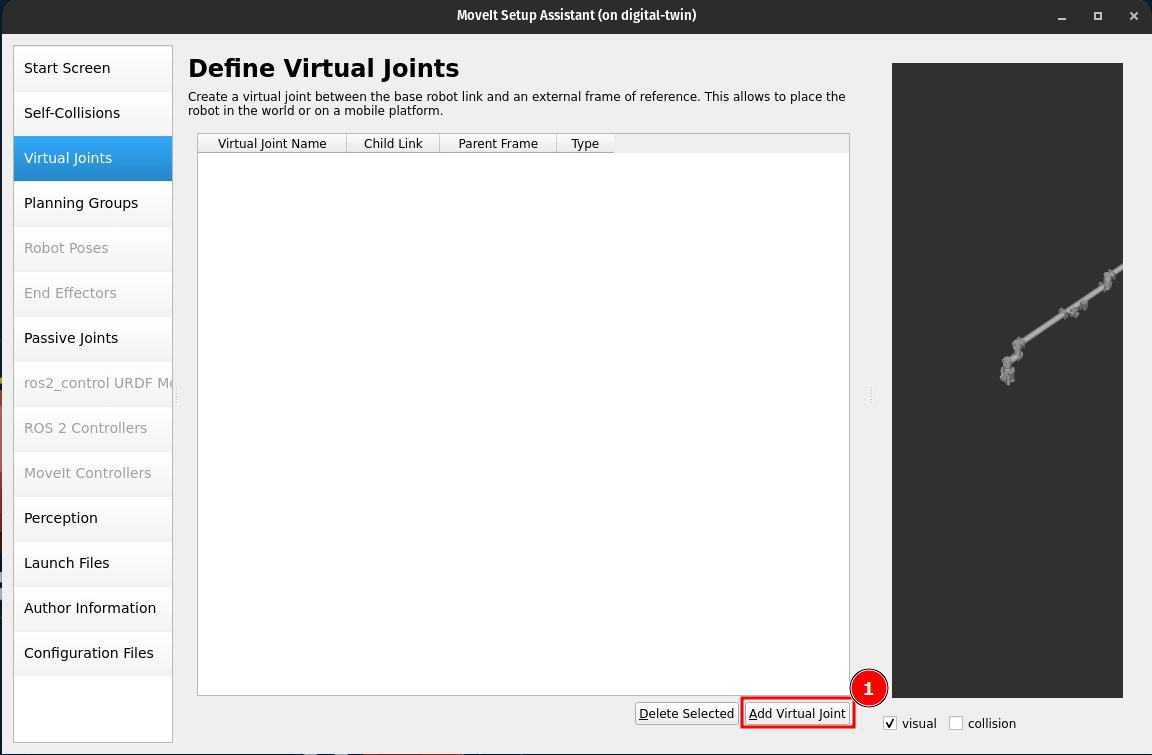 Now Click on Add Virtual Joint, to Add a dummy joint to plant the robot to the world frame.