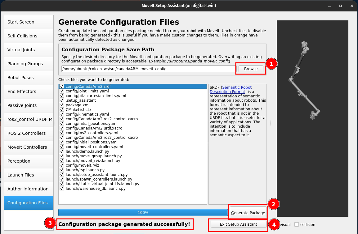 If The Process is successful, then a Message should Show up saying that the Package has been successfully Generated and then Click on Exit Setup Assistant to safely close the Moveit node. (Refer Image Below):