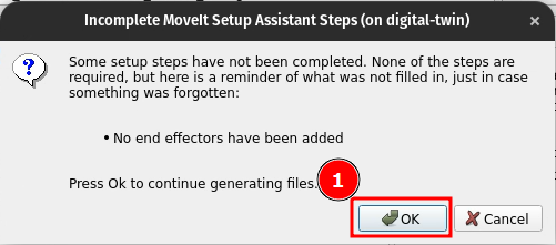 Since I didn't have any end-effectors setup in my Configuration a Warning like the one below will pop-up (Its a Warning !, so We Ignore...We only care for Errors) and Click on OK.