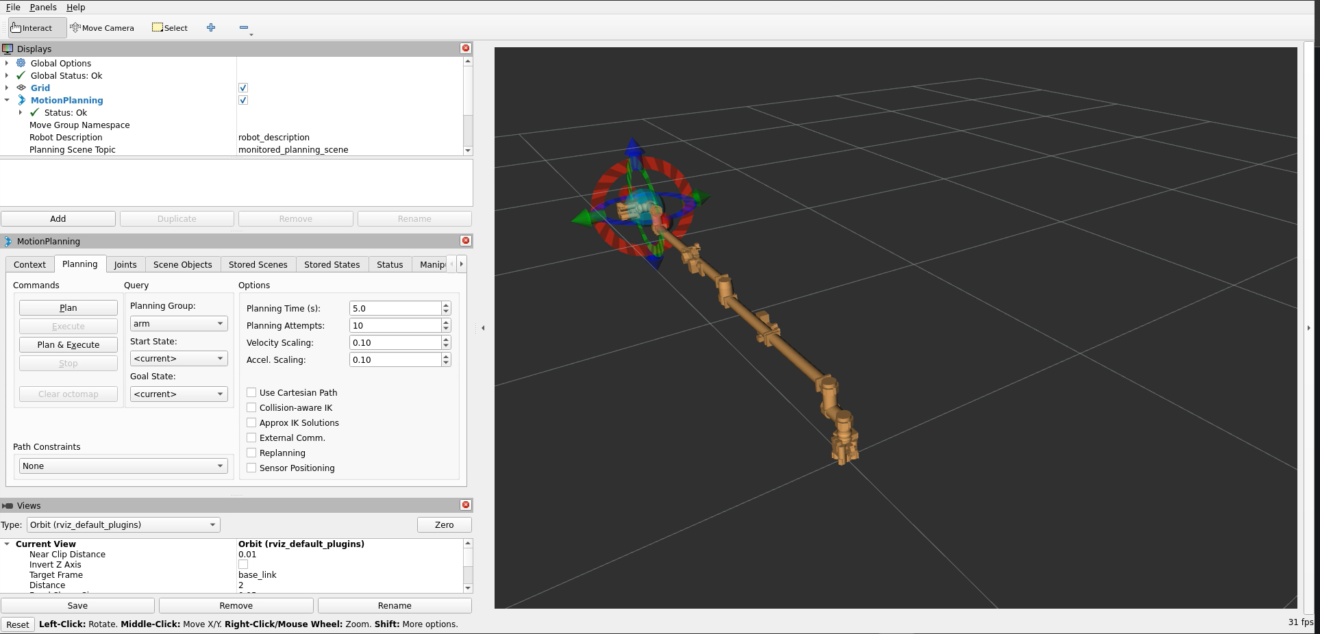 ros2 launch canadaARM_moveit_config demo.launch.py use_sim_time:=falseThe Robot should load in Rviz, as seen below: