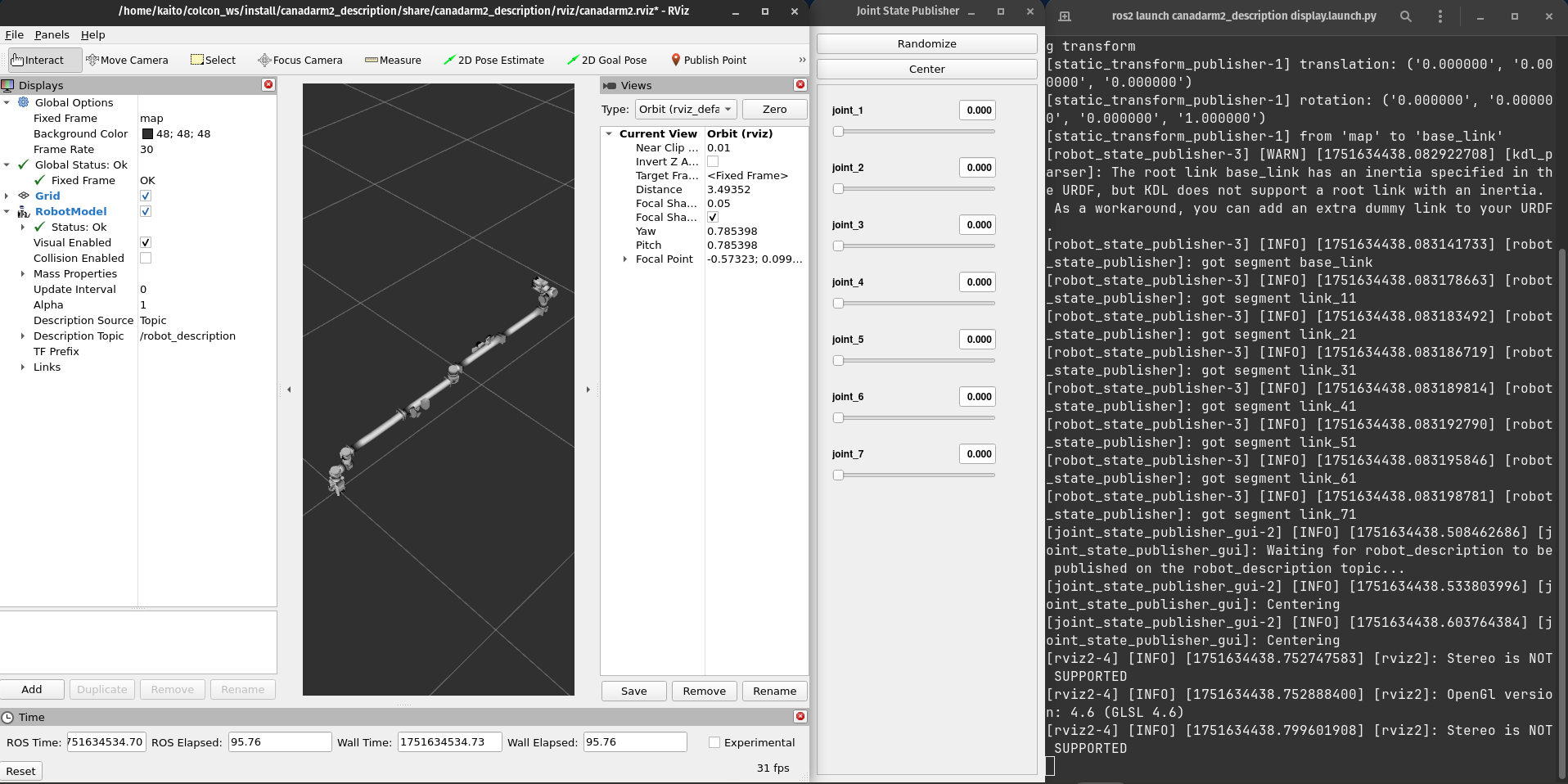ros2 launch canadarm2_description display.launch.py- RViz should open, and you should see your robot model.